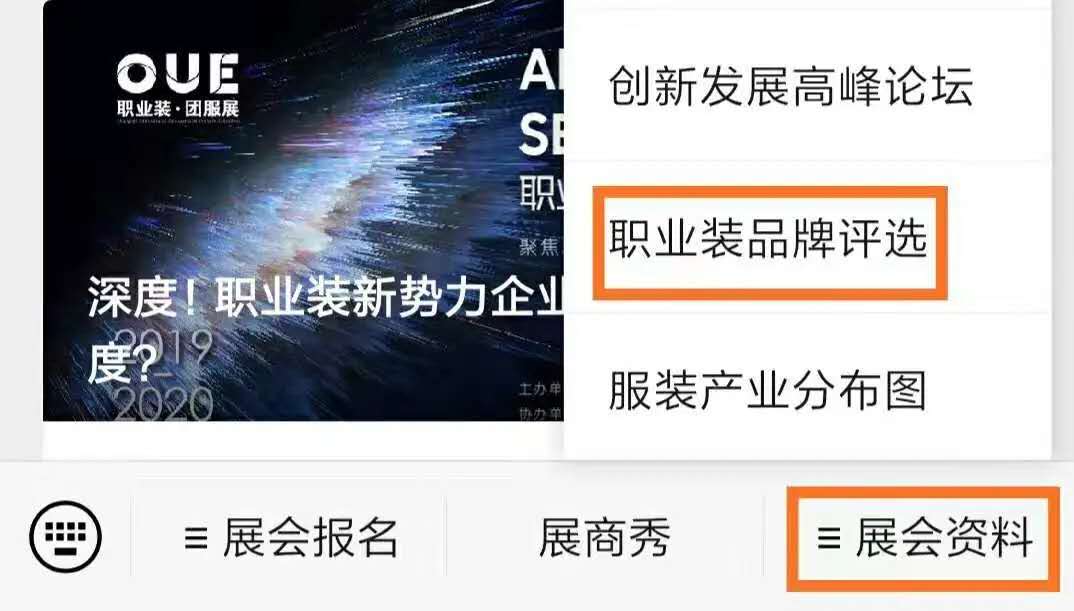 ①關注官方微信公眾號”OUE職業裝團服展”,點擊右下角展會資料—職業裝品牌評選