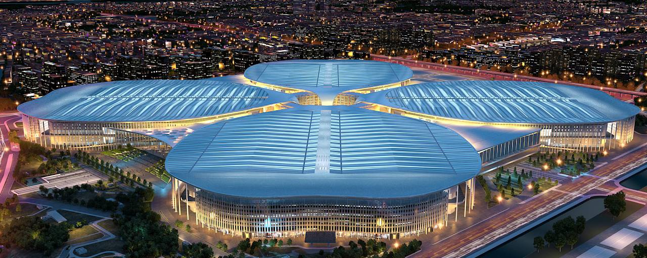 國家會展中心(虹橋)地處上海虹橋商務(wù)區(qū)核心區(qū)西部,“四葉草”布局結(jié)構(gòu),147萬平方米的建筑面積,卓越的現(xiàn)代會議、論壇配套功能與展館零距離銜接的酒店設(shè)施,每日可供15萬人次用餐的商業(yè)保障能力。