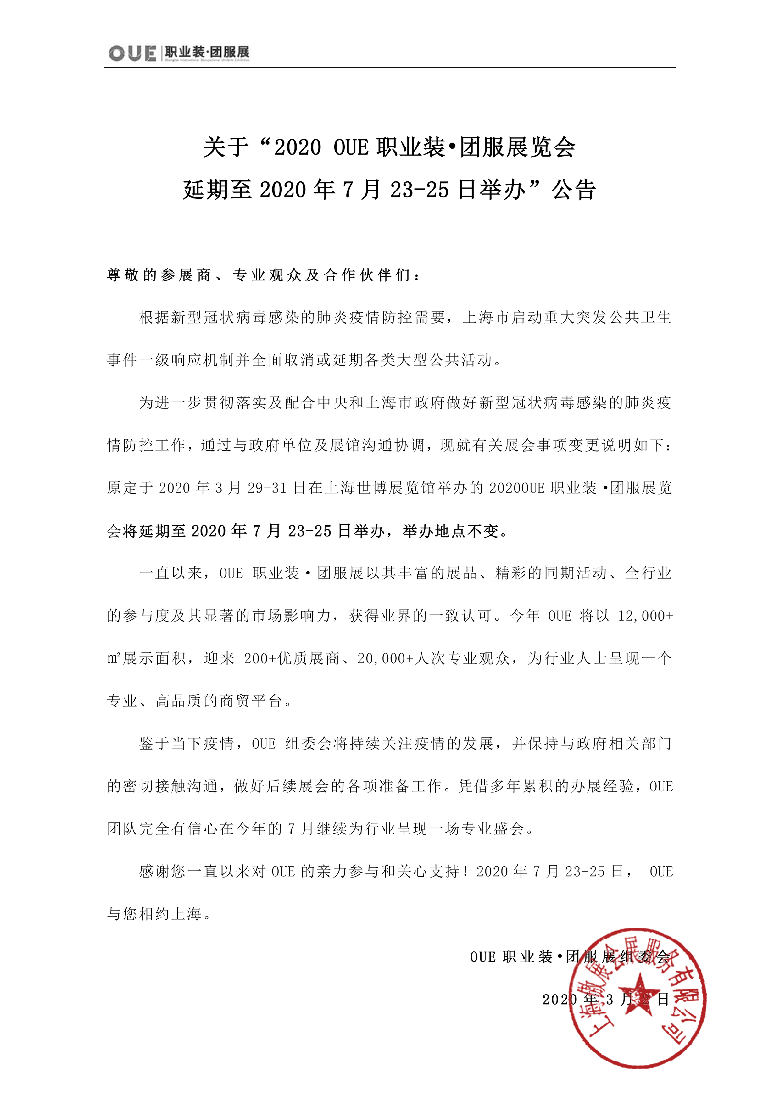 尊敬的參展商、觀眾及合作伙伴們:根據新型冠狀病毒感染的肺炎疫情防控需要,上海市啟動重大突發公共衛生事件一級響應機制并全面取消或延期各類大型公共活動。為進一步貫徹落實及配合中央和上海···