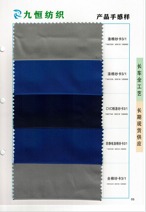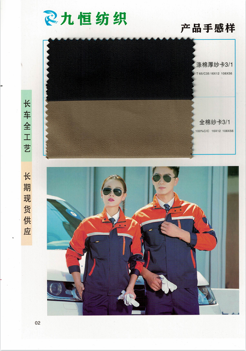 工裝面料:全棉/滌棉紗卡、帆布、細斜(全系士林染料);嗶嘰布,襯衫布。全棉彈力,CVC,T/R,防靜電,防阻燃,醫用漂白,耐氯及其他特種面料。